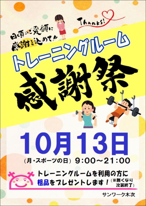 トレーニングルーム感謝祭のお知らせ☆ 2025.10.07 #サンワーク木次 ☆トレーニングルーム感謝祭のお知らせ☆ 日頃の感謝を込めて10月13日はトレーニングルーム感謝祭を行います。 当日限りの握力測定イベントを実施をします。 粗品も用意してますので皆様のお越しをお待ちしております。 ※粗品はなくなり次第終了となります。 サンワーク木次