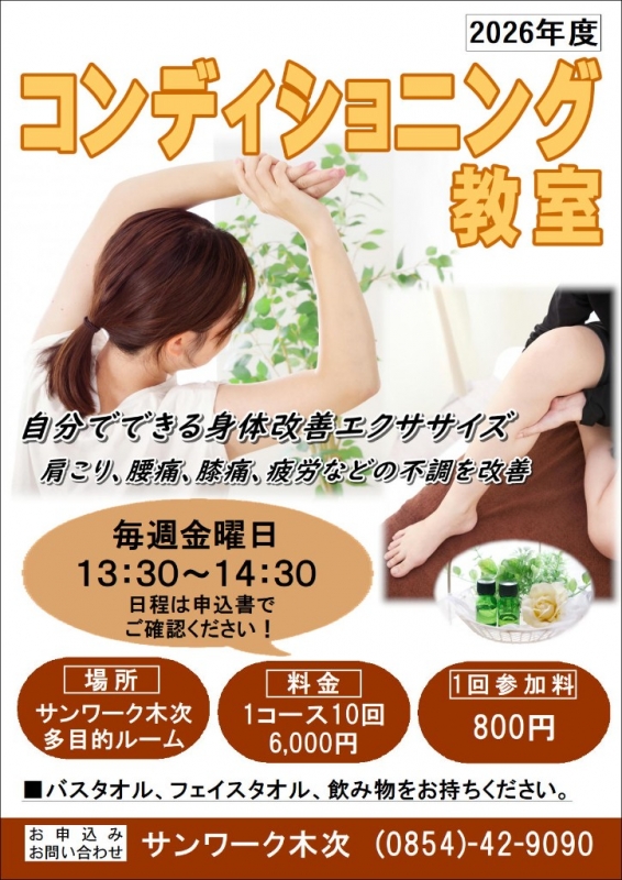 2026年4月スタート!第1回コンディショニング教室参加者募集について 2026.02.26 #サンワーク木次 #教室 2026年4月スタート! 第1回コンディショニング教室の参加者募集についてお知らせ コンディショニングで身体の調子を整えませんか 初回は4月10日(金)13:30~14:40です。 詳しい内容や日程については申込書やカレンダーでご確認いただくか、 お気軽にお問い合わせください。 皆様の参加をお待ちしております! ◇◆お問い合わせ◆◇ サンワーク木次 0854-42-9090