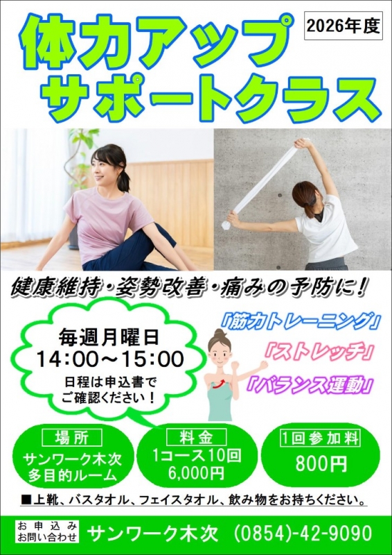 2026年4月スタート!第1回体力アップサポートクラス参加者募集について 2026.02.26 #サンワーク木次 #教室 2026年4月スタート! 第1回体力アップサポートクラス参加者募集についてお知らせ 自分の身体のためにできることから始めませんか 初回は4月13日(月)14:00~15:00です。 詳しい内容や日程については申込書でご確認いただくか、 お気軽にお問い合わせください。 皆様の参加をお待ちしております。 ◇◆お問い合わせ◆◇ サンワーク木次 42-9090