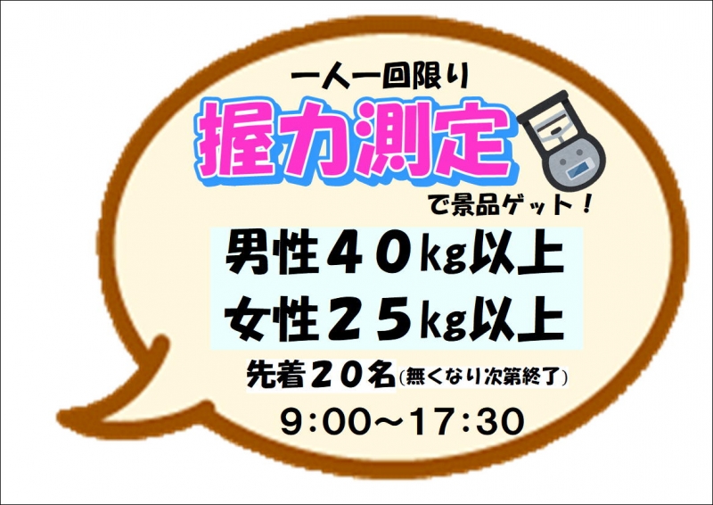 トレーニングルーム感謝祭のお知らせ☆ 2025.10.07 #サンワーク木次 ☆トレーニングルーム感謝祭のお知らせ☆ 日頃の感謝を込めて10月13日はトレーニングルーム感謝祭を行います。 当日限りの握力測定イベントを実施をします。 粗品も用意してますので皆様のお越しをお待ちしております。 ※粗品はなくなり次第終了となります。 サンワーク木次