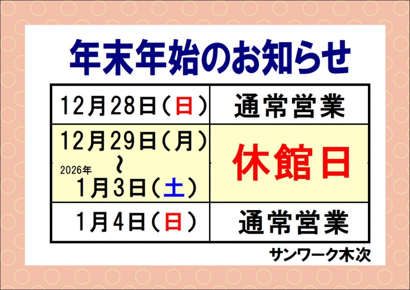 サンワーク木次 年末年始休業のお知らせ 2025.12.09 #サンワーク木次 #年末年始 いつもサンワーク木次をご利用いただきありがとうございます。 サンワーク木次では、上記の期間を年末年始休業とさせていただきます。 よろしくお願いいたします。