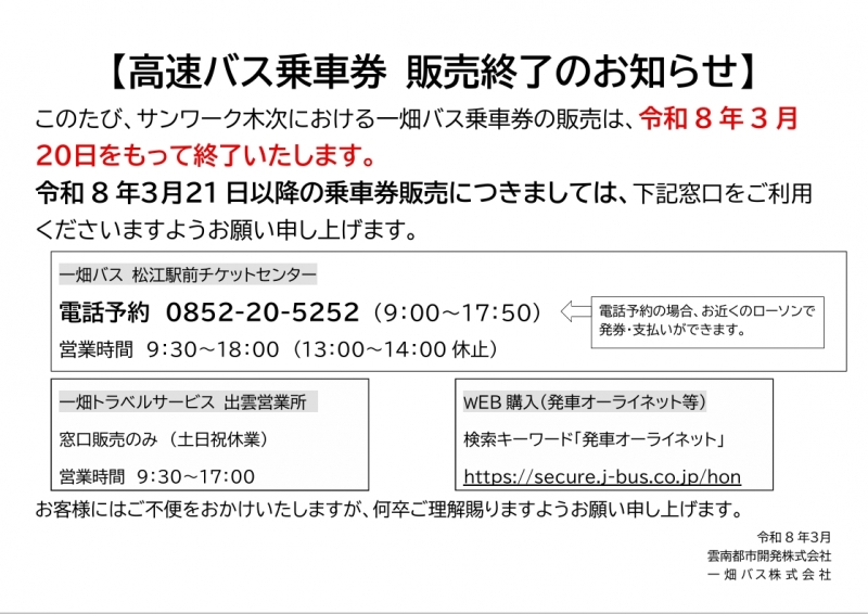 2026年3月20日 一畑高速バス乗車券販売終了のお知らせ